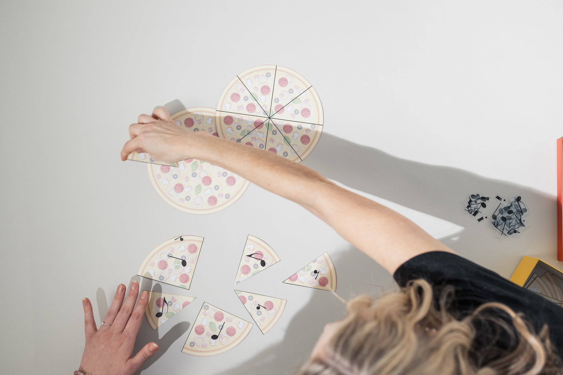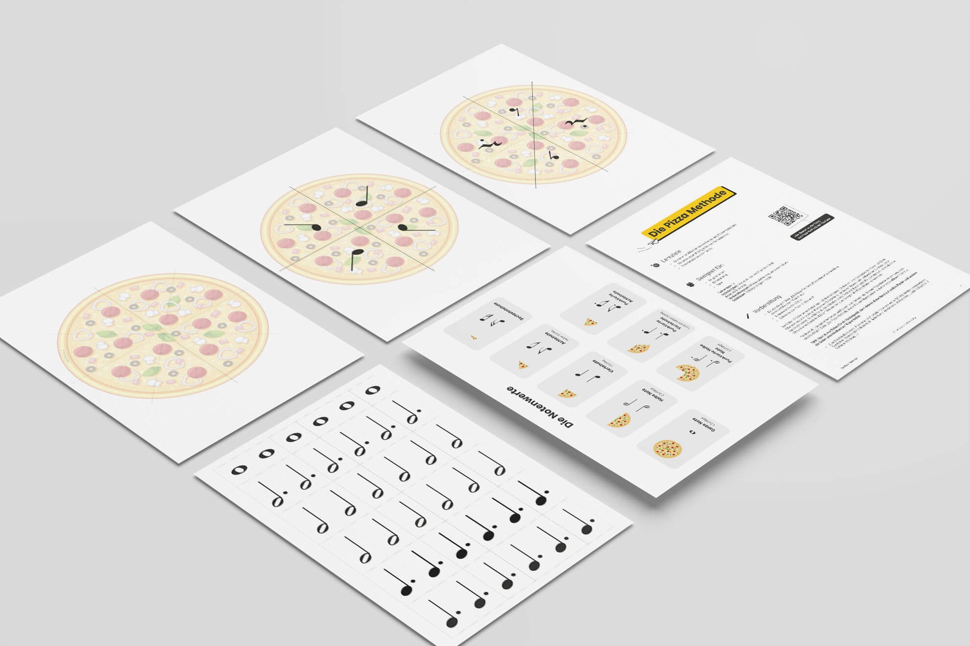 - 29 Seiten rund um Pizza und Pizza-Stücke (Ganze Pizza = Ganze Note, Viertel-Pizza = Viertelnote)