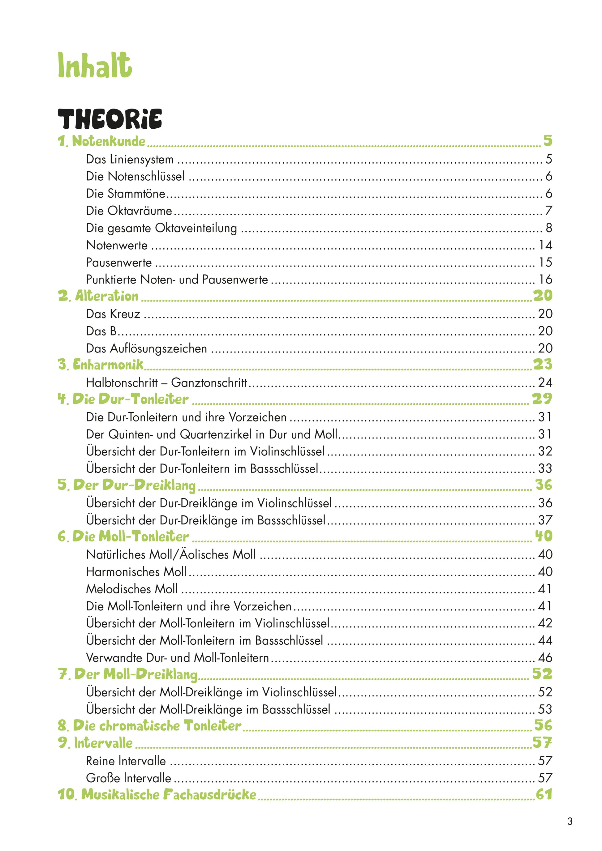 Typisch für die „Theoriesteine-Reihe“ ist auch Theoriesteine 1 in die Großkapitel „Musiktheorie“, „Gehörbildung“ und „Rhythmik“ unterteilt.